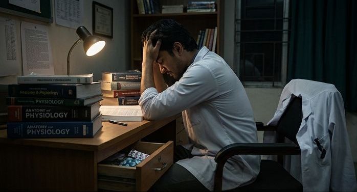 রাত তখন গভীর। চারপাশের পৃথিবী যখন ঘুমের অতল গহ্বরে নিমজ্জিত, ঠিক তখন কোনো এক নির্জন কক্ষের কোণে একটি নিভু নিভু আলো জ্বলছে। টেবিলের ওপর পাহাড়সম বইয়ের স্তূপ—অ্যানাটমি, ফিজিওলজি আর প্যাথলজির নিষ্ঠুর অক্ষরগুলো যেন জীবন্ত হয়ে শিক্ষার্থীর টুঁটি চেপে ধরতে চাইছে। সাদা অ্যাপ্রনটা পাশের চেয়ারে অবহেলায় ঝুলে আছে—ঠিক যেন একজোড়া অদৃশ্য ডানা, যা উড়তে ভুলে গেছে। যে হাতগুলো দিয়ে আগামীর কোনো এক ভোরে কোনো এক মুমূর্ষু শিশুর নাড়ি পরীক্ষা করার কথা ছিল, সেই হাতগুলোই আজ কাঁপছে—এক মুঠো ঘুমের ওষুধ আর এক টুকরো বিষণ্ণতার মোহে।