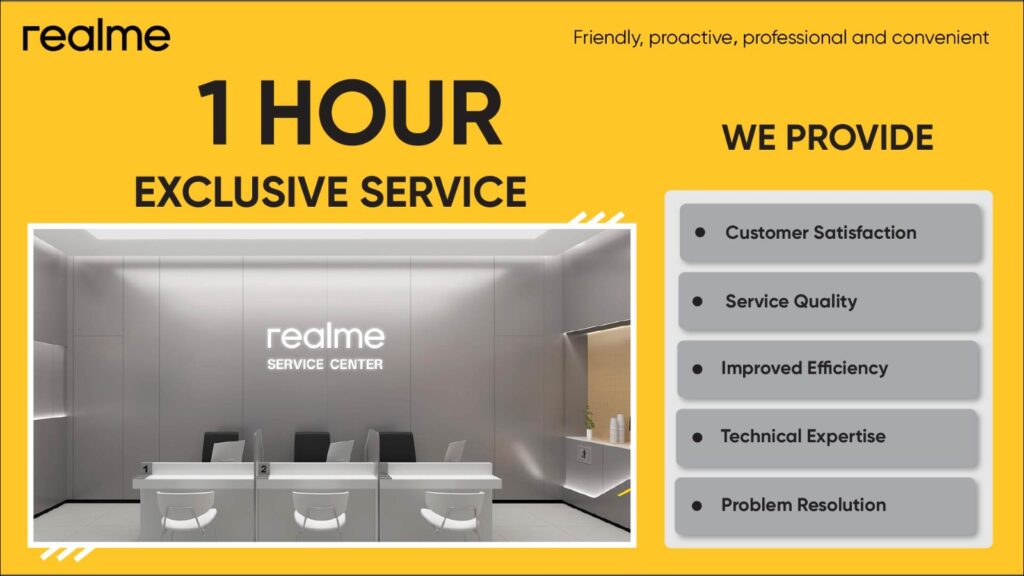 রিয়েলমির সাম্প্রতিক তথ্য অনুযায়ী, অফিসিয়াল সার্ভিস সেন্টারে আসা প্রায় ৯৭ শতাংশ ক্রেতা মাত্র এক ঘণ্টার মধ্যেই তাঁদের ডিভাইসের প্রয়োজনীয় সার্ভিসিং বুঝে পাচ্ছেন। ডিভাইসটি সার্ভিস ডেস্কে জমা দেওয়া থেকে শুরু করে মেরামত শেষে গ্রাহকের হাতে ফেরত দেওয়া পর্যন্ত পুরো প্রক্রিয়াটিই এই ৬০ মিনিটের মধ্যে সম্পন্ন করা হচ্ছে।