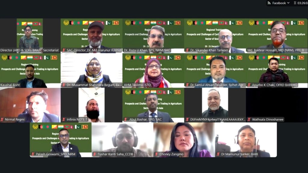দক্ষিণ এশিয়ার কৃষি খাতে কার্বন ট্রেডিংয়ের সম্ভাবনা ও চ্যালেঞ্জ বিষয়ক তিন দিনব্যাপী একটি আঞ্চলিক প্রশিক্ষণ কর্মসূচি আজ সোমবার (২৯ ডিসেম্বর ২০২৫) ভার্চ্যুয়াল প্ল্যাটফর্মে শুরু হয়েছে। সার্ক এগ্রিকালচার সেন্টার (SAC) আয়োজিত এই কর্মসূচিতে সার্কভুক্ত দেশ ও বিদেশের নীতি-নির্ধারক, গবেষক, উন্নয়ন কর্মী এবং বেসরকারি খাতের প্রতিনিধিরা অংশ নেন। দক্ষিণ এশিয়ায় টেকসই কৃষি ও জলবায়ু সুরক্ষা নিশ্চিত করতে কার্বন ট্রেডিং কীভাবে সহায়ক হতে পারে, তা অন্বেষণ করাই এই আয়োজনের মূল লক্ষ্য।