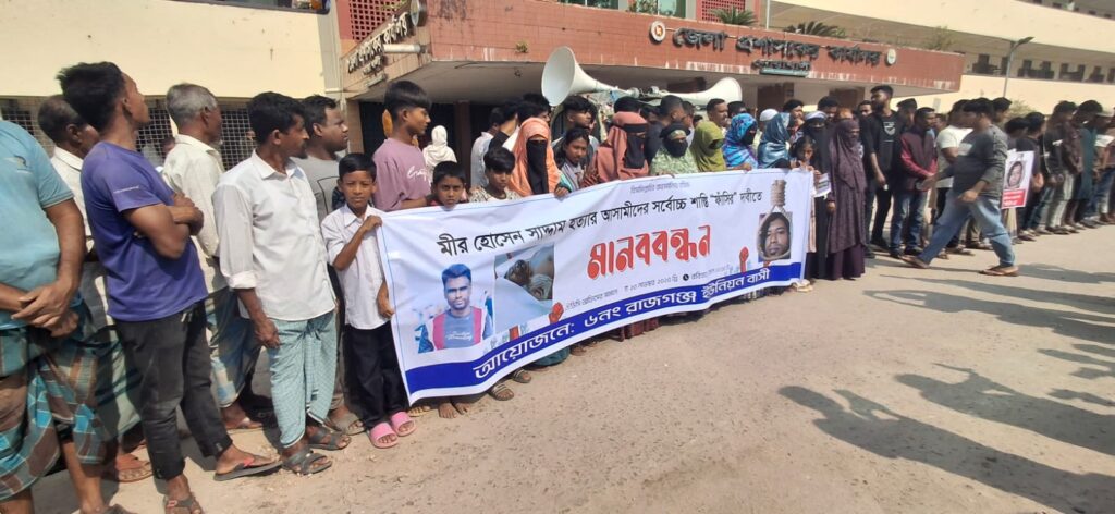 নোয়াখালীর বেগমগঞ্জ উপজেলার রাজগঞ্জ ইউনিয়ন ছাত্রদল নেতা মীর হোসেন সাদ্দাম এর হত্যাকারীদের আইনের আওতায় এনে শাস্তি নিশ্চিতের দাবিতে নোয়াখালী জেলা প্রশাসক কার্যালয়ের সামনে মানববন্ধন করেছে নিহত সাদ্দামের পরিবার, স্বজন ও এলাকাবাসী।