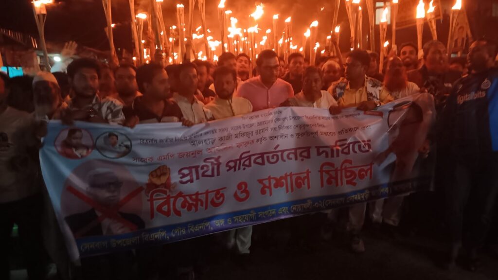নোয়াখালী-২ (সেনবাগ -সোনাইমুড়ি আংশিক) আসনে বিএনপির ঘোষিত মনোনয়ন পরিবর্তনের দাবিতে মশাল মিছিল করেছে অপর মনোনয়ন প্রত্যাশী কেন্দ্রীয় বিএনপির কার্যনির্বাহী কমিটির সদস্য, সেনবাগ উপজেলা বিএনপির সাবেক সাধারণ সম্পাদক ও সেনবাগ উপজেলা পরিষদের সাবেক চেয়ারম্যান আলহাজ্ব কাজী মফিজুর রহমানের সমর্থকরা।