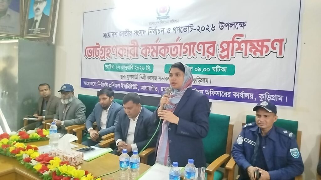 আসন্ন ত্রয়োদশ জাতীয় সংসদ নির্বাচন ও গণভোট ২০২৬ সুষ্ঠু, অবাধ ও নিরপেক্ষভাবে সম্পন্ন করার লক্ষ্যে কুড়িগ্রামের ফুলবাড়ীতে ভোটগ্রহণকারী কর্মকর্তাদের দিনব্যাপী কর্মদক্ষতা উন্নয়ন প্রশিক্ষণ অনুষ্ঠিত হয়েছে। সোমবার (২৭ জানুয়ারি) সকাল ৯টায় ফুলবাড়ী ডিগ্রি কলেজের সভাকক্ষে এই প্রশিক্ষণ কার্যক্রম শুরু হয়।