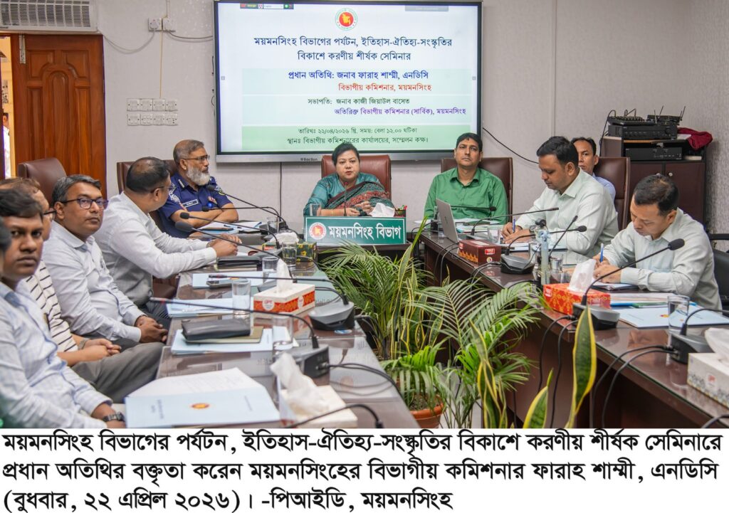সংস্কৃতি ও বৈচিত্র্যময় ময়মনসিংহ বিভাগকে পর্যটন শিল্পে সমৃদ্ধ করে গড়ে তুলতে সংশ্লিষ্ট সকল দপ্তরকে জোরালোভাবে কাজ করার আহ্বান জানিয়েছেন বিভাগীয় কমিশনার ফারাহ শাম্মী এনডিসি। বুধবার (২২ এপ্রিল ২০২৬) বিভাগীয় কমিশনার কার্যালয়ের সম্মেলন কক্ষে আয়োজিত এক বিশেষ সেমিনারে প্রধান অতিথির বক্তব্যে তিনি এই আহ্বান জানান।