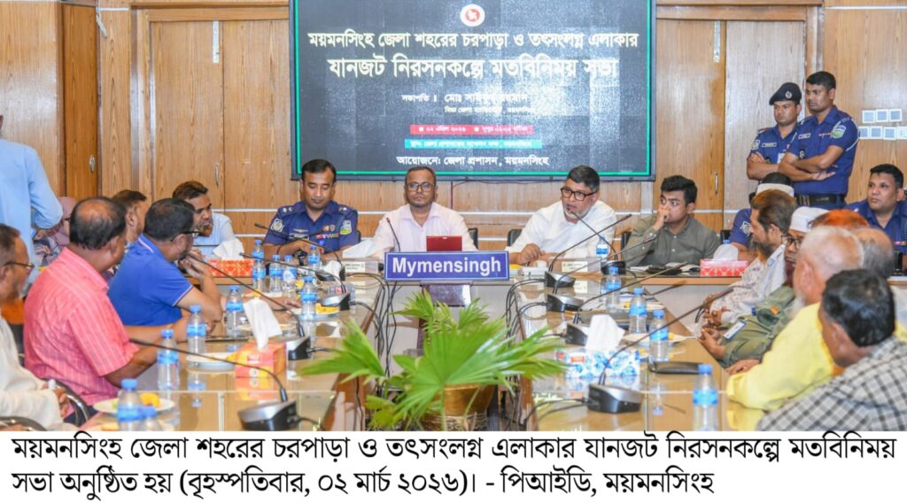 ময়মনসিংহ শহরের অন্যতম ব্যস্ত এলাকা চরপাড়া ও তৎসংলগ্ন অঞ্চলের দীর্ঘদিনের তীব্র যানজট সমস্যা নিরসনে এক বিশেষ মতবিনিময় সভা অনুষ্ঠিত হয়েছে। বৃহস্পতিবার (০২ এপ্রিল) দুপুরে জেলা প্রশাসনের আয়োজনে জেলা প্রশাসকের সম্মেলন কক্ষে এই সভাটি অনুষ্ঠিত হয়।