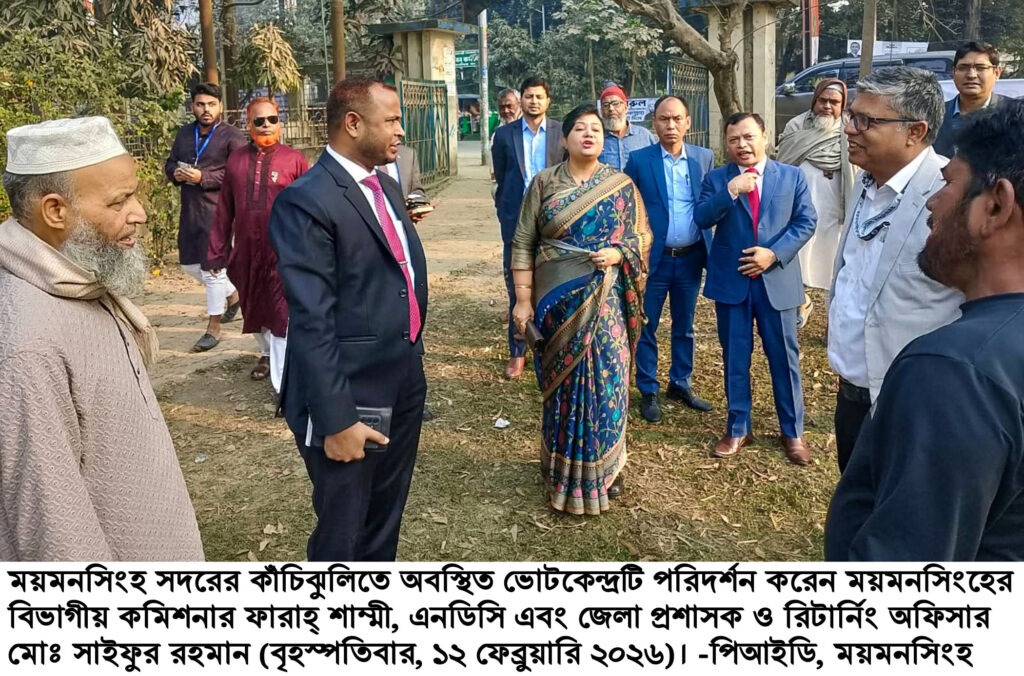 সকালে ময়মনসিংহের বিভাগীয় কমিশনার ফারাহ্ শাম্মী, এনডিসি এবং জেলা প্রশাসক ও রিটার্নিং অফিসার মোঃ সাইফুর রহমান কাঁচিঝুলির ময়মনসিংহের ওয়েলফেয়ার স্কুল ভোটকেন্দ্র পরিদর্শন করেন। এ সময় তারা ভোটারদের সাথে কথা বলেন এবং সুষ্ঠু পরিবেশ বজায় থাকায় সন্তোষ প্রকাশ করেন।