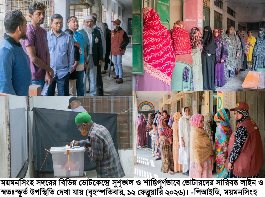 ময়মনসিংহ সদরের গুরুত্বপূর্ণ ভোটকেন্দ্রগুলো সরেজমিনে ঘুরে দেখা গেছে ভোটারদের ব্যাপক উৎসাহ। বিদ্যাময়ী সরকারি বালিকা উচ্চ বিদ্যালয়, জিলা স্কুল, কাশর পুলিশ লাইন উচ্চ বিদ্যালয়, কাঁচিঝুলি সরকারি প্রাথমিক বিদ্যালয় ও নাসিরাবাদ কলেজ কেন্দ্রগুলোতে সকাল থেকেই ছিল দীর্ঘ সারি। তরুণ ও নতুন ভোটারদের উপস্থিতি ছিল চোখে পড়ার মতো। বেলা বাড়ার সাথে সাথে ভোটার উপস্থিতি ও ভোট প্রদানের হার আরও বৃদ্ধি পাচ্ছে।