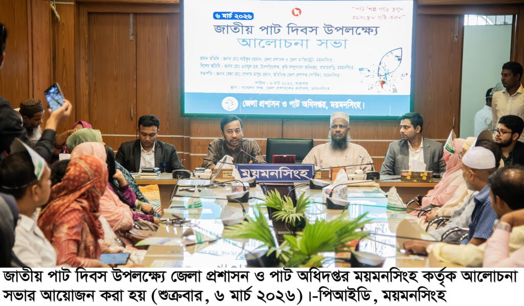 “পাট দিবস গড়ে তুলুন, কর্মসংস্থান সৃষ্টি করুন”—এই প্রতিপাদ্য নিয়ে ময়মনসিংহে যথাযোগ্য মর্যাদায় জাতীয় পাট দিবস-২০২৬ পালিত হয়েছে। শুক্রবার (৬ মার্চ) সকালে ময়মনসিংহ জেলা প্রশাসন ও পাট অধিদপ্তরের যৌথ উদ্যোগে বর্ণাঢ্য র্যালি ও আলোচনা সভা অনুষ্ঠিত হয়।
