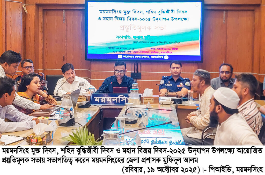 আসন্ন ময়মনসিংহ মুক্ত দিবস (১০ ডিসেম্বর), শহীদ বুদ্ধিজীবী দিবস (১৪ ডিসেম্বর) ও মহান বিজয় দিবস-২০২৫ (১৬ ডিসেম্বর) উদযাপন উপলক্ষে ময়মনসিংহে প্রস্তুতিমূলক সভা অনুষ্ঠিত হয়েছে। আজ বুধবার (৫ নভেম্বর) ময়মনসিংহ জেলা প্রশাসনের আয়োজনে দপ্তর কার্যালয়ের সম্মেলন কক্ষে এই সভা অনুষ্ঠিত হয়।