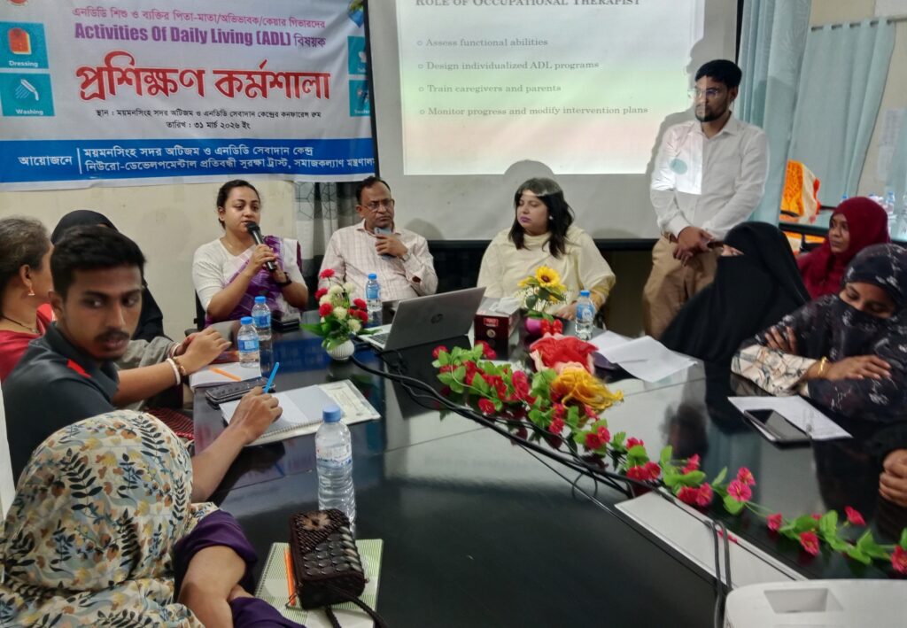 ময়মনসিংহ সদর অটিজম ও এনডিডি সেবাদান কেন্দ্রের কনফারেন্স রুমে এনডিডি শিশু ও ব্যক্তিদের পিতা-মাতা, অভিভাবক ও কেয়ার গিভারদের জন্য ‘অ্যাক্টিভিটিস অব ডেইলি লিভিং’ (ADL) বিষয়ক এক বিশেষ প্রশিক্ষণ কর্মশালা অনুষ্ঠিত হয়েছে।