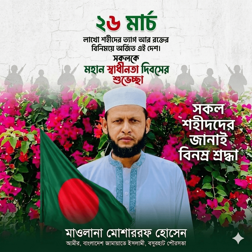 মহান স্বাধীনতা দিবস উপলক্ষে সকল বীর শহীদদের প্রতি বিনম্র শ্রদ্ধা জানিয়েছেন বসুরহাট পৌরসভা জামায়াতে ইসলামীর আমীর মাওলানা মোশাররফ হোসেন। ২৬ মার্চ মহান স্বাধীনতা ও জাতীয় দিবস উপলক্ষে এক বার্তায় তিনি দেশের সকল শহীদ মুক্তিযোদ্ধাদের গভীর শ্রদ্ধার সাথে স্মরণ করেন এবং দেশবাসীকে স্বাধীনতা দিবসের শুভেচ্ছা জানান।