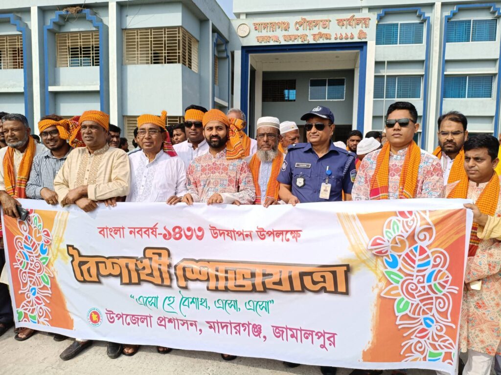 আজ মঙ্গলবার (১৪ এপ্রিল) সকাল ৯টায় উপজেলা প্রশাসনের আয়োজনে মাদারগঞ্জ পৌরসভা চত্বর থেকে একটি বর্ণাঢ্য র্যালি বের করা হয়। র্যালিটি শহরের প্রধান সড়ক প্রদক্ষিণ করে উপজেলা চত্বরে এসে শেষ হয়। এরপর বাঙালির চিরচেনা ঐতিহ্য পান্তা-ইলিশ ভোজের মাধ্যমে উৎসবের আমেজ ছড়িয়ে পড়ে।