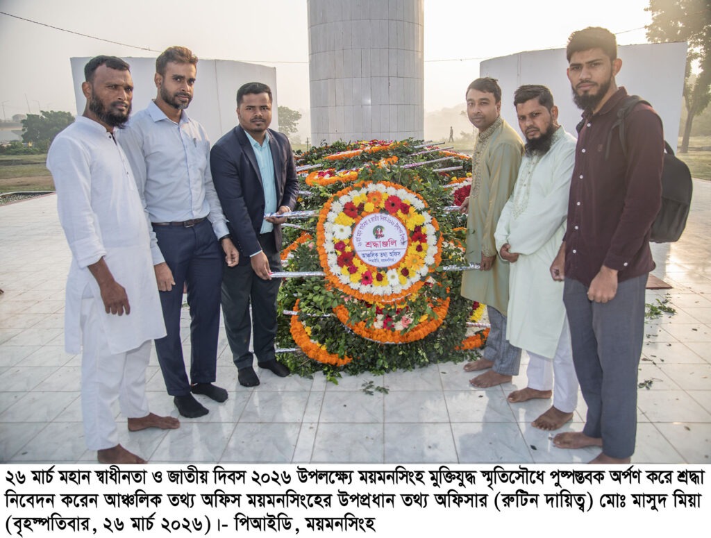 বৃহস্পতিবার (২৬ মার্চ) ভোরে সূর্যোদয়ের সাথে সাথে যথাযথ বিধি ও মাপ অনুযায়ী জাতীয় পতাকা উত্তোলনের মধ্য দিয়ে দিবসের সূচনা করা হয়। এরপর আঞ্চলিক তথ্য অফিস ময়মনসিংহের উপপ্রধান তথ্য অফিসার (রুটিন দায়িত্ব) মোঃ মাসুদ মিয়ার নেতৃত্বে ময়মনসিংহ মুক্তিযুদ্ধ স্মৃতিসৌধে পুষ্পস্তবক অর্পণ ও শহীদদের প্রতি গভীর শ্রদ্ধা নিবেদন করা হয়।