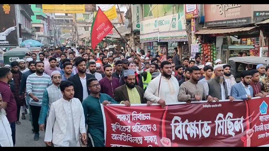 শাহজালাল বিজ্ঞান ও প্রযুক্তি বিশ্ববিদ্যালয় কেন্দ্রীয় ছাত্র সংসদ (শাকসু) নির্বাচন চার সপ্তাহের জন্য স্থগিত করার প্রতিবাদে এবং অবিলম্বে নির্বাচনের নতুন তারিখ ঘোষণার দাবিতে নোয়াখালীর সেনবাগে বিক্ষোভ মিছিল ও সমাবেশ করেছে ইসলামি ছাত্রশিবির। বৃহস্পতিবার (২২ জানুয়ারি) বিকেলে সেনবাগ পৌর শহরে এই প্রতিবাদ কর্মসূচি পালন করা হয়।