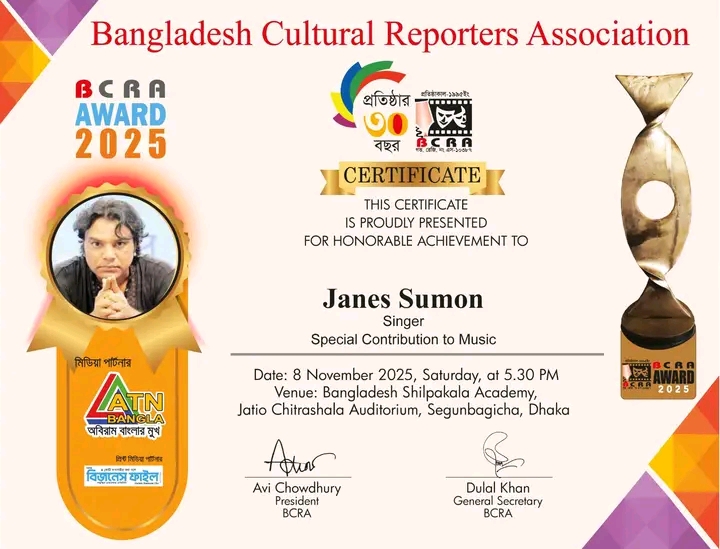 বাংলাদেশের জনপ্রিয় রক ও ব্যান্ড সংগীত তারকা জেনস সুমনকে তাঁর দীর্ঘ সংগীত জীবনে বিশেষ অবদানের (Special Contribution to Music) স্বীকৃতিস্বরূপ বাংলাদেশ কালচারাল রিপোর্টার্স অ্যাসোসিয়েশন (BCRA) অ্যাওয়ার্ড ২০২৫ প্রদান করা হয়েছে।