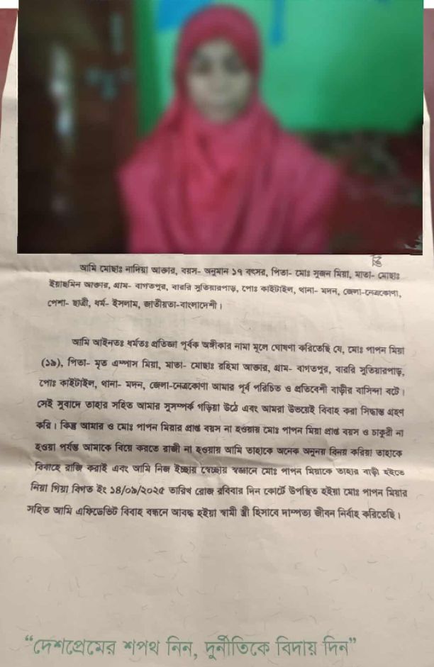 নেত্রকোণার মদন উপজেলায় প্রেমের সম্পর্কের জেরে কোর্ট ম্যারেজ করা এক দম্পতিকে ঘিরে চাঞ্চল্যের সৃষ্টি হয়েছে। মামলার পর স্বামী কারাগারে গেলেও অপ্রাপ্তবয়স্ক স্ত্রী নাদিয়া আক্তার (১৬) স্বামীর মুক্তির দাবিতে বারবার বাবার জিম্মা থেকে পালিয়ে শ্বশুরবাড়িতে চলে আসছেন।
