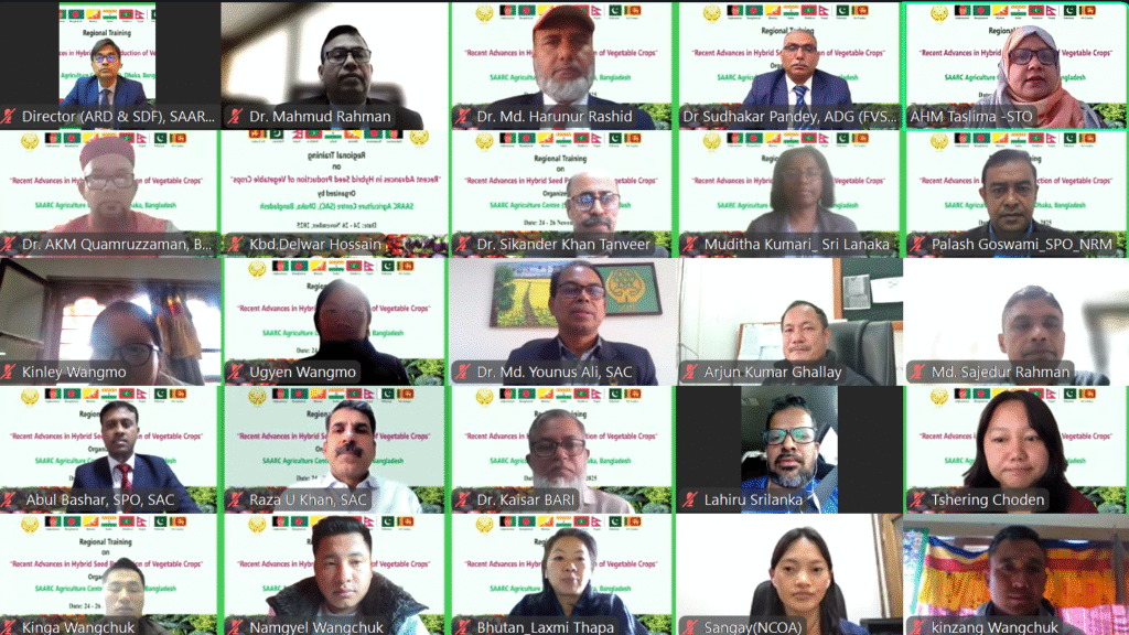 দক্ষিণ এশিয়ার সবজি বীজ খাতে প্রযুক্তিগত অগ্রগতি ও আঞ্চলিক সহযোগিতা বৃদ্ধি করার লক্ষ্যে সার্ক কৃষি কেন্দ্র (এসএসি) আয়োজিত তিন দিনব্যাপী ভার্চুয়াল প্রশিক্ষণ কর্মশালা “সার্ক সদস্য দেশসমূহে সবজি ফসলের হাইব্রিড বীজ উৎপাদনে সাম্প্রতিক অগ্রগতি” আজ সোমবার (২৪ নভেম্বর ২০২৫) উদ্বোধন করা হয়। প্রশিক্ষণের মূল উদ্দেশ্য হলো সদস্য দেশগুলোর অংশগ্রহণকারীদের হাইব্রিড সবজি বীজ উৎপাদনে ব্যবহৃত সর্বশেষ কৌশল সম্পর্কে ধারণা প্রদান করা। সার্কের বিভিন্ন দেশ থেকে বিজ্ঞানী ও বিশেষজ্ঞরা এতে অংশ নিচ্ছেন।